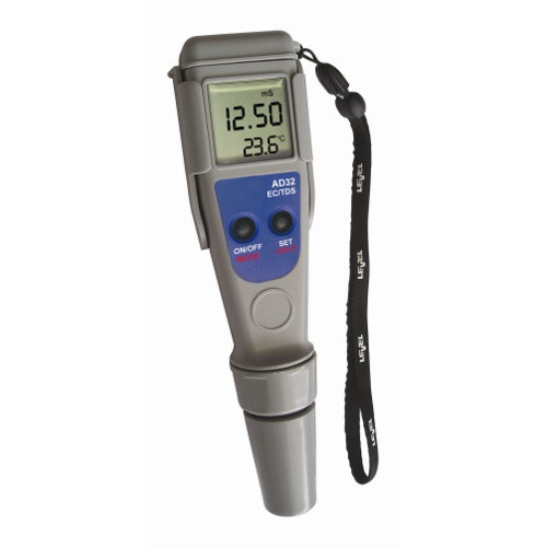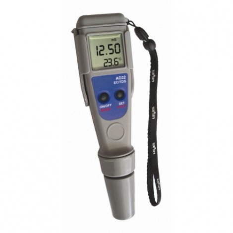 Το AD32 είναι ένα αδιάβροχο (IP67) φορητό αγωγιμόμετρο τσέπης για μέτρηση αγωγιμότητας (μS/cm) και TDS (ppm) σε υγρά διαλύματα, νερό και απόβλητα. Διαθέτει παράλληλα αυτόματη αντιστάθμισης θερμοκρασίας.