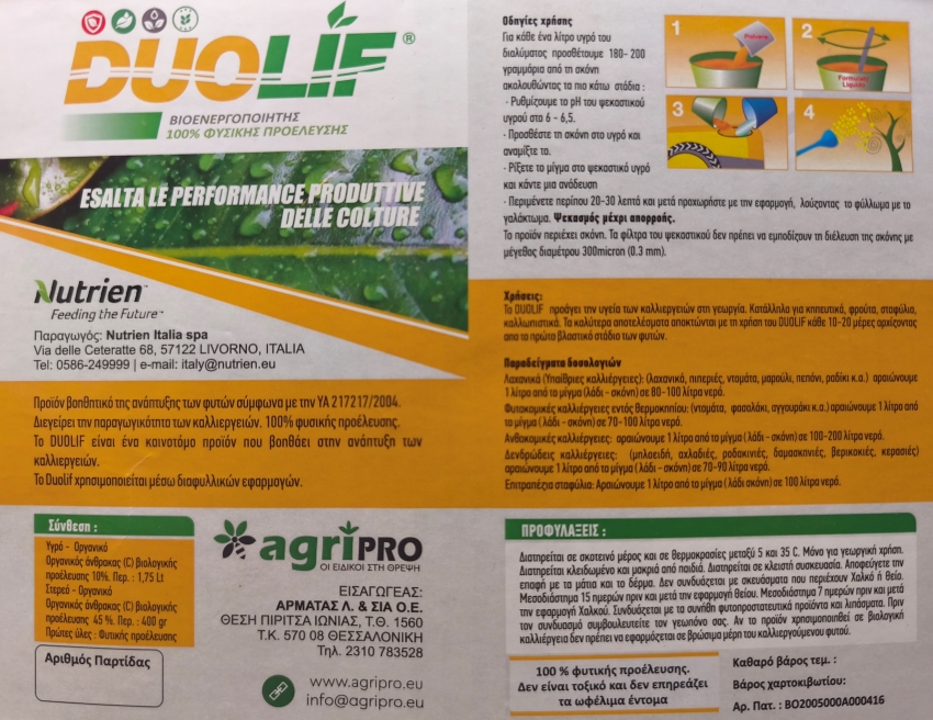 Το DUOLIF είναι ένα διφασικό προϊόν κατάλληλο για χρήση και στην Βιολογική γεωργία σύμφωνα με τον Ευρωπαϊκό Κανονισμό αριθ. 889/2008 για τα Προϊόντα Φυτικής Προέλευσης και πιστοποιημένο από τον εξωτερικό οργανισμό: SIAN - Sistema Informativo Agricolo Nazionale.