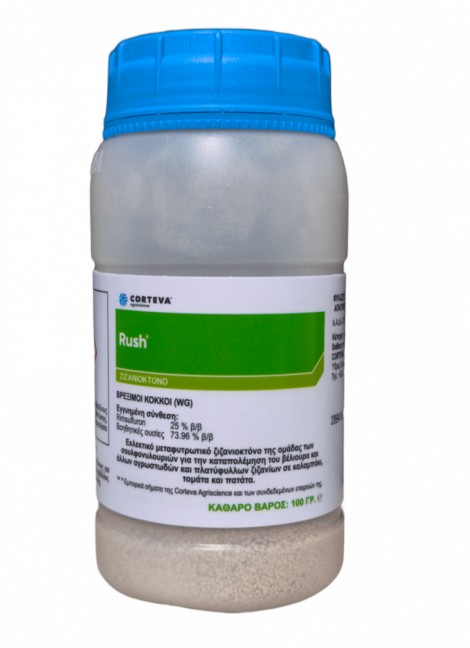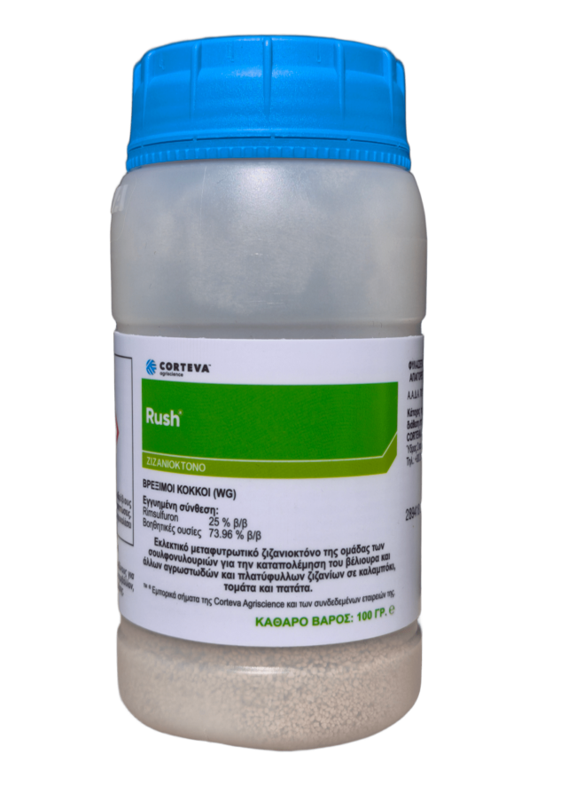 Το RUSH® WG είναι εκλεκτικό μεταφυτρωτικό ζιζανιοκτόνο της ομάδας των σουλφονυλουριών για την καταπολέμηση του βέλιουρα και άλλων αγρωστωδών και πλατύφυλλων ζιζανίων σε καλαμπόκι, τομάτα και πατάτα.