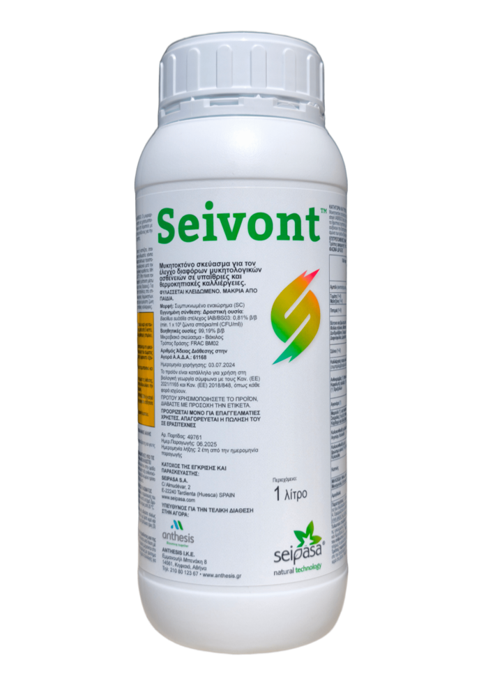 Το SEIVONT είναι ένα φυσικό μυκητοκτόνο με μεταβολίτες και σπόρια του Bacillus subtilis (στέλεχος IAB/BS03) για τον έλεγχο διαφόρων μυκητολογικών ασθενειών σε υπαίθριες και θερμοκηπιακές καλλιέργειες. Το στέλεχος Bacillus subtilis strain IAB/BS03 δρα με τρεις διαφορετικούς τρόπους έναντι των παθογόνων μυκήτων: • ανταγωνίζεται αποτελεσματικά τα παθογόνα, για το χώρο και τα θρεπτικά συστατικά, μέσω των αποικιών που αναπτύσσει στην επιφάνεια φύλλων του φυτού • παράγει και απελευθερώνει λιποπεπτίδια τα οποία αυξάνουν την διαπερατότητα των κυτταρικών μεμβρανών των μυκήτων καταστρέφοντας τους βλαστικούς σωλήνες και το μυκήλιο τους • επάγει την άμυνα των φυτών (διεγείρει την παράγωγη PR-1 πρωτεΐνης, η οποία είναι ικανή να αποδομεί μυκηλιακές δομές).
